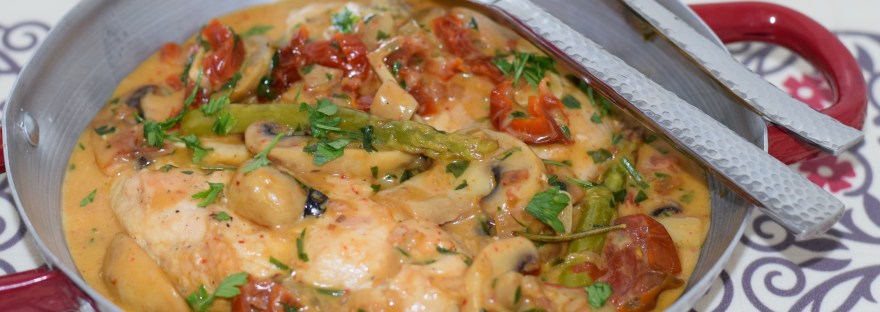 Preparatul pe care vi-l prezint astăzi aparține grupei sud-europene a bucătăriei mediteraneene și are la bază câteva ingrediente simple, dar pline de savoare: pui, sparanghel, ciuperci, roșii uscate, mirodenii, smântână, nelipsitul ulei de măsline extravirgin.