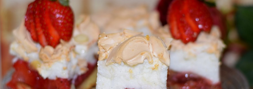 - Bezeau rezultată se așază peste blatul cu căpșuni și se formează valuri pentru un aspect mai interesant. Se dă la cuptor cca 30 de minute. La exterior trebuie să fie ușor maronie și să fi format o crustă tare. Se scoate din cuptor și se lasă la răcit în tavă, abia apoi se poate scoate și felia.