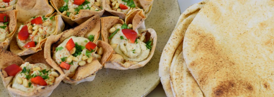 - Lipiile libaneze se taie în 4 și se introduce fiecare bucățică într-o cavitate a formei. Se ung în interior cu puțin ulei de măsline. Se coc cca 8 minute. Se scoate tava din cuptor și se lasă la răcorit cca 10 minute. Apoi se scot coșulețe astfel formate și se pun pe o farfurie. Se dau la o parte.