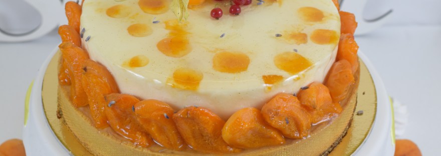 Mousse-ul de mascarpone odată glazurat se așază centrat pe tarta cu crème brûlée. Pe margini se așază frumos caisele coapte. Se decorează după imaginație. Eu am folosit physalis, coacăze și lavandă. Se servește alături de cei dragi! 🙂