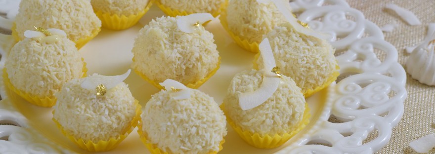 - Se pune fiecare în câte o chesă, iar deasupra, cu un strop de ciocolată topită se lipește câte un fulg mare de cocos și se așază delicat foiță de aur.