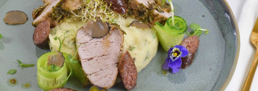 În centrul farfuriei se montează piure (într-un inel de inox de 10 cm). Se așază după imaginație bucăți de carne, felii de castravete tăiate subțire pe lung și rulate, felii de cârnăciori, vlăstari de măzăre, flori comestibile ș.a.. Opțional, se pot rade fâșii de trufe ici și colo.