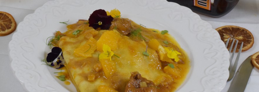 - Într-o tigaie, se toarnă 1 polonic mic de sos, se adaugă clătitele umplute, suprapuse ușor, iar apoi se toarnă restul de sos cu fructele confiate. Se adaugă Cointreau și se flambează.