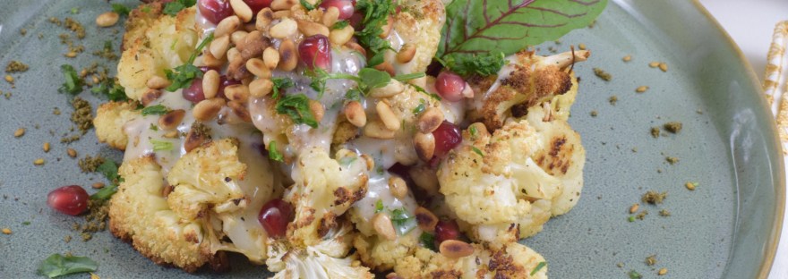 Am mâncat prima dată acest preparat în Israel, dar este originar din Antiohia. Preparatul în sine apare atât în bucătăria tradițională turcă, dar și în Siria; de facto, însă, este prezent în totul Orientul, în diferite variații care pornesc de la aceeași bază: conopidă, tahina, zeamă de lămâie – ca ingrediente principale. Eu vă prezint astăzi o variantă pe care o consider extrem de delicioasă, căreia i-am adăugat muguri de pin ușor prăjiți și bobițe de rodie, o combinație de vis în opinia mea. Conopida este larg răspândită în bucătăria orientală, fiind adesea prăjită simplu în ulei sau trecută printr-o panadă (cazul Egiptului, de ex.). Bine zicea Mark Twain, conopida este o varză educată. Și pe bună dreptate, are doar efecte pozitive asupra sănătății (nu că varza n-ar avea! :D): este o sursă excelentă de fibre, purifică sângele și detoxifică ficatul, conține antioxidanți și minerale etc. Eu mă delectez cu acest preparat la prânz sau cină, mi se pare o alegere vegană excelentă, inclusiv pentru acele zile când ne săturăm de carne sau alte proteine animale.