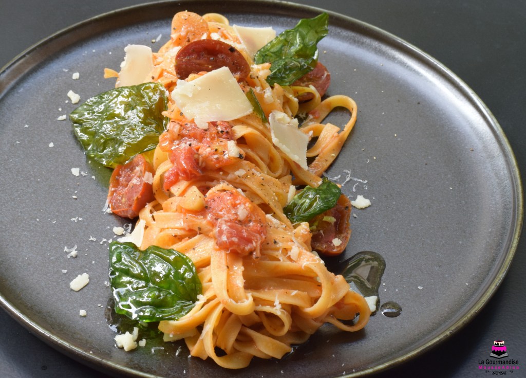 - Se încălzește ulei de măsline într-o tigaie (cca 50 ml), se pune usturoiul copt, se călește 1 minut, se adaugă roșiile, ardeiul iute și frunzele de busuioc, se călesc toate 2-3 minute. Se condimentează cu sare și piper. Se adaugă sosul de roșii și se lasă la gătit 2-3 minute. Se adaugă 1/2 polonic din apa în care fierb pastele. Se adaugă spanacul.