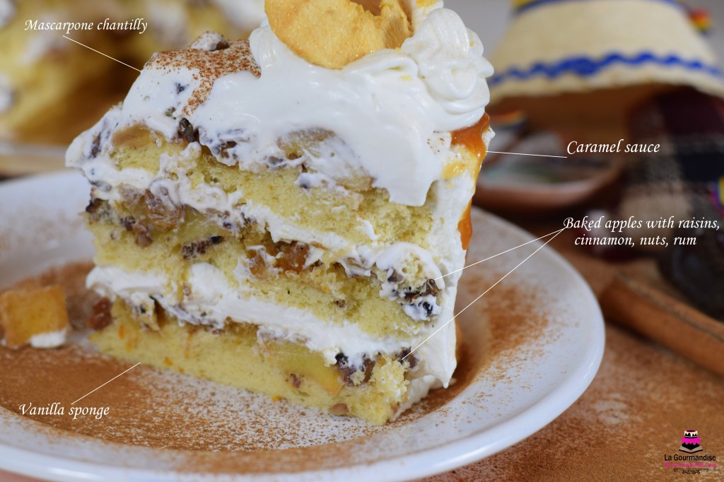 Merele se spală și se curăță de coajă. Cu ustensila specială se îndepărtează cășuța de sâmburi, fiecare măr se taie în 4 sau în 8 dacă sunt mai mari merele. Se stropesc cu zeamă de lămâie. Zahărul (1) se caramelizează, apoi se adaugă untul, se amestecă bine și se toarnă în tava mare a cuptorului. Merele se pun în tavă peste caramel, în strat uniform. Se presară stafidele scurse de rom, coaja de portocale confiate și nuca. Se coc 25-30 minute în cuptorul preîncălzit la 200°C. În minutul 20, se începe pregătirea pandișpanului. Ouăle se separă, albușurile se spumează cu un praf de sare până prind volum, apoi se adaugă treptat zahărul. Trebuie să rezulte o bezea fermă, lucioasă. Gălbenușurile se amestecă cu pasta de vanilie și coaja de portocale rasă, apoi se încorporează în albușuri. La final, se încorporează și făina cernută în prealabil. Se scot merele din cuptor, se presară scorțișoară, temperatura cuptorului se scade la 180°C. Se toarnă aluatul peste mere și se nivelează. Se coace 25-30 minute sau până când trece testul cu scobitoarea. Se scoate din cuptor și se trece cu lama cuțitului pe marginile blatului. Se acoperă cu o tavă la fel de mare și se răstoarnă imediat cu merele în sus, cu o mișcare fermă. Se lasă la răcit complet (preferabil peste noapte). A doua zi, se decupează trei blaturi cu un cerc de inox de 18 cm diametru. Cercul se tapetează apoi cu folie de acetofan de 10-12 cm.