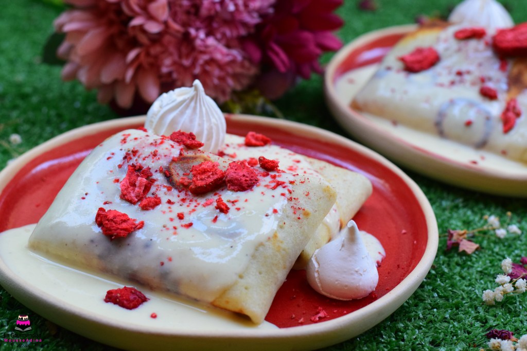 Asamblare: Fiecare clătită se umple cu cremă de brânză, se împăturește după preferințe (pachețele, evantai, rulou), se așază în farfurie și se servește cu sos de vanilie (cald sau rece). Se decorează după preferințe, eu am decorat cu căpșune liofilizate și bezele.
