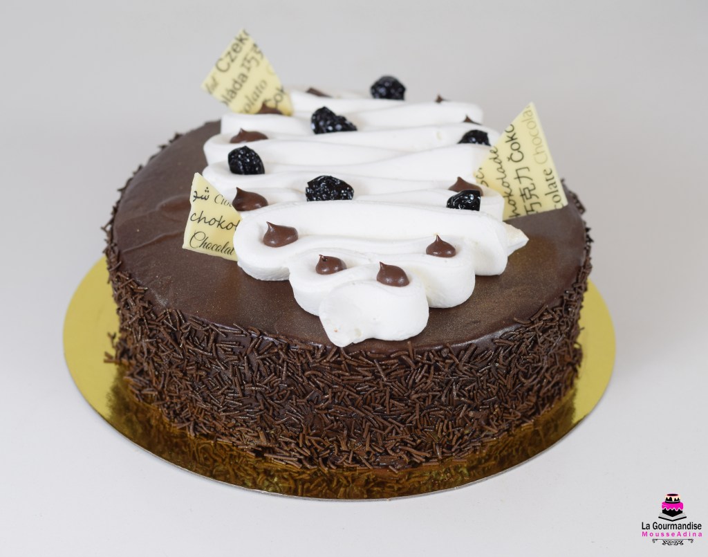 Glazura de ciocolată: Se încălzește frișca cu zahărul invertit până aproape de punctul de fierbere și se toarnă peste ciocolată. Se omogenizează cu un mixer vertical. Se folosește imediat pentru glazurarea tortului. Tortul glazurat se dă la rece pentru cca 30 minute. Se îmbracă pe margini cu strasuri de ciocolată. Opțional, se poate pudra cu spray auriu comestibil.