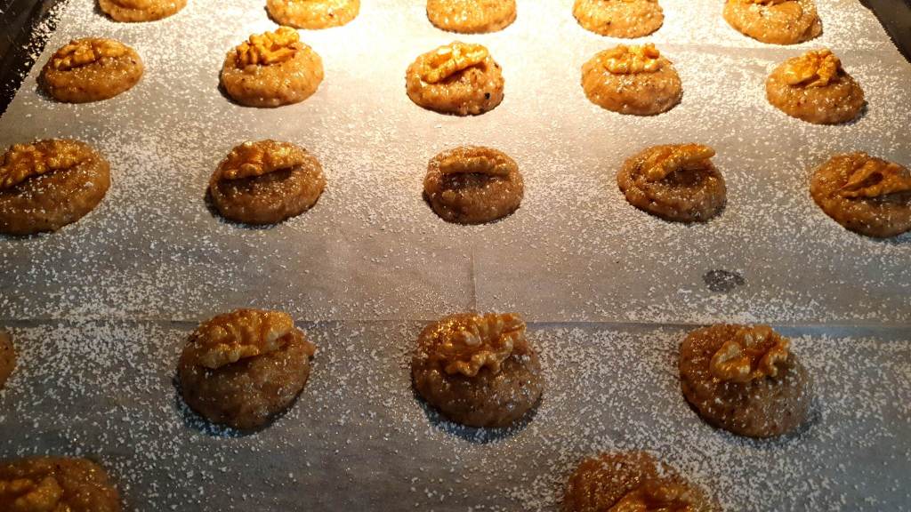 Se preîncălzește cuptorul la 150℃ și se tapetează o tavă mare cu hârtie de copt. Compoziția se transferă într-un poș și se poșează 25-30 de pricomigdale, cu distanță între ele. Dacă aveți tavă mai mică sau considerați că nu încap într-o singură tavă, le puteți coace în două. Mie îmi ies 25 de bucăți din aceste cantități și îmi ajunge o singură tavă. Se cerne zahărul pudră peste pricomigdale, într-un strat subțire, apoi, pe fiecare pricomigdală, se așază câte 1/2 jumătate de nucă pudrată cu pudră aurie. Se coc 20 de minute la funcția căldură sus+jos sau ventilație, desigur, asta depinde de cuptorul pe care îl aveți. Se scot și se lasă la răcit complet, în tavă. Se depozitează într-un recipient închis etanș/ ermetic. Au un grad mare de durabilitate în teorie, în practică însă, nu știu dacă este cazul (hihi).