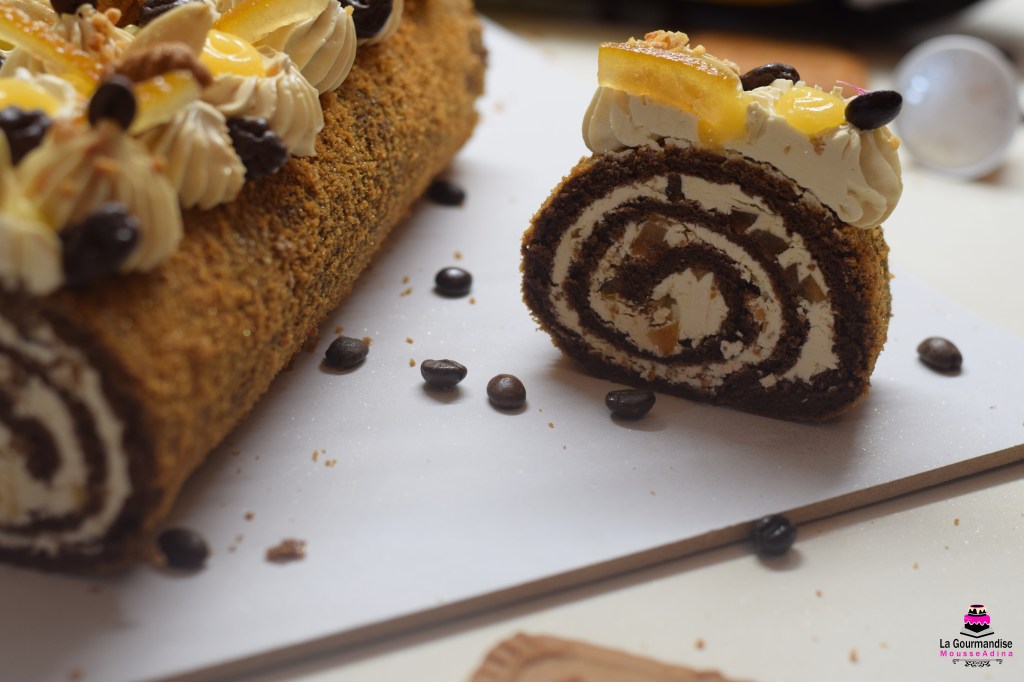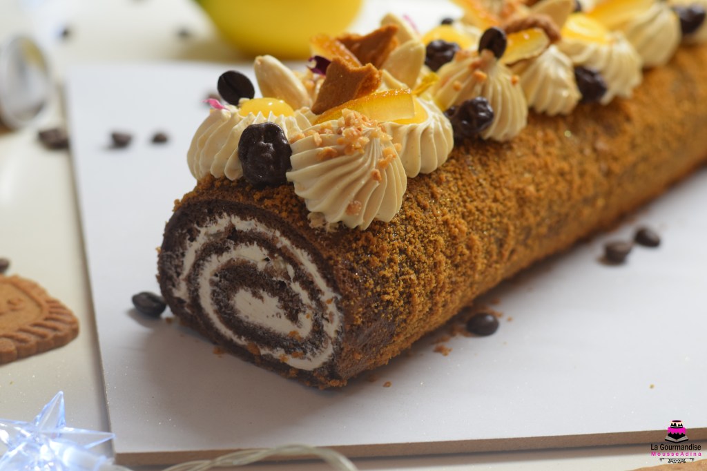 Asamblare și decor: Foaia de ruladă se desface, se unge cu 2/3 din cremă în strat uniform, se presară coaja de portocală confiată și barotul de arahide caramelizate și se rulează strâns, cu atenție. Se dă la rece 15 minute. Între timp, se macină biscuiții Lotus, iar ciocolata se topește împreună cu uleiul la bain-marie. Rulada se unge uniform cu ciocolata topită și se tăvălește imediat prin biscuiții măcinați. Se decorează cu restul de cremă păstrată la temperatura camerei și pusă într-un poș cu duiul preferat, nuci/ migdale/ alune, drajeuri de ciocolată, coajă de portocală confiată și lemon curd care se inserează în micile cavități create în avelinele de cremă ici și colo. Desigur, dvs. puteți să decorați după inspirație, să adăugați sau să eliminați dintre elementele de decor folosite de mine. Se lasă la rece înainte de porționare. În funcție de precizia porționării, rezultă 10-12 felii de prăjitură. Este un deliciu! Se poate păstra 3-4 zile la frigider sau mai mult, la congelator.