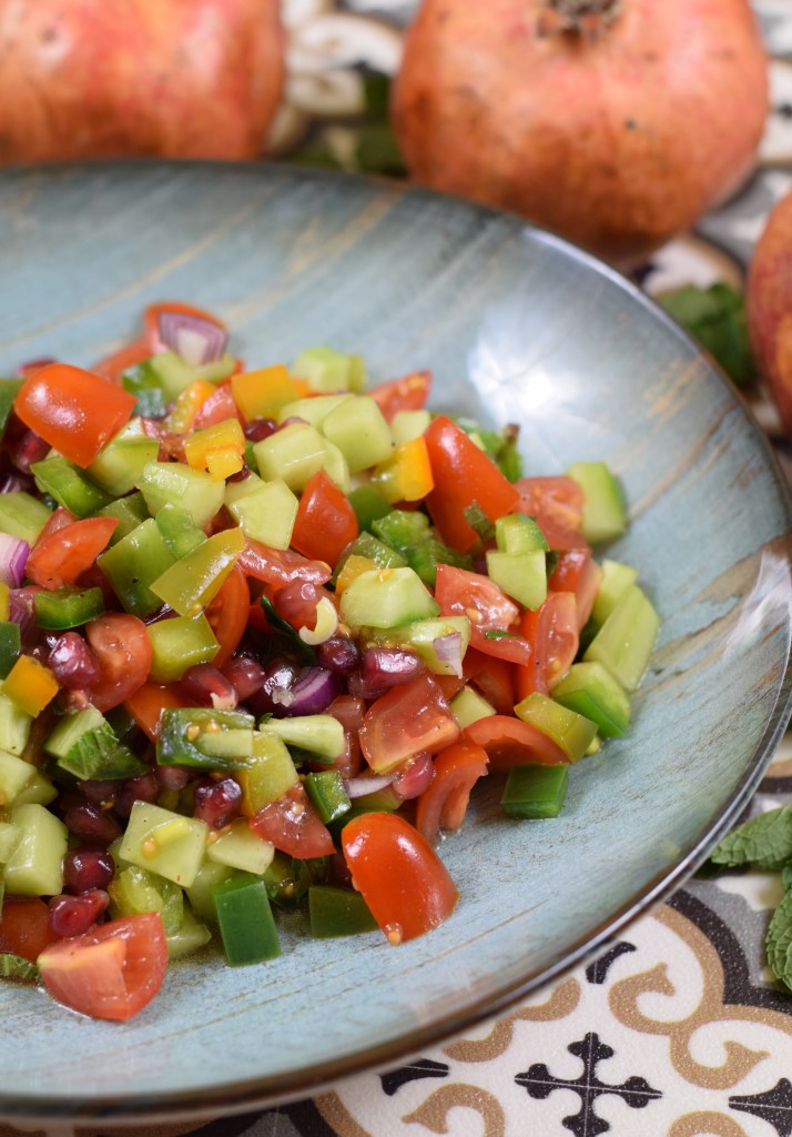 Bucătăria persană conține și utilizează multe fructe, folosite în stare proaspătă sau uscată, precum și o mare varietate de legume, ca de ex.: dovlecei, spanac, fasole verde, fasole fava, morcovi, vinete (supranumite și ”cartofi iranieni”), ceapă și usturoi. Roșiile, castraveții și ceapa crudă însoțesc adesea o masă sub forma celei mai cunoscute salate: salad-e shirazi.