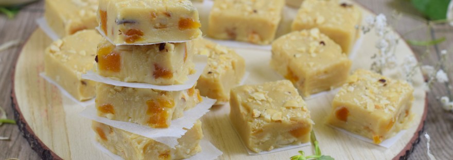 Fudge de ciocolată albă cu alune de pădure, caise și lichior de cafea