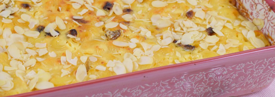 Budincă de macaroane cu stafide și portocale confiate