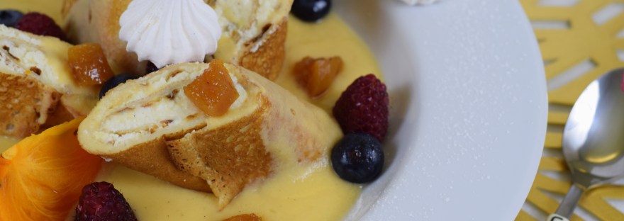 Clătite cu brânză dulce și fructe macerate, în sos de vanilie