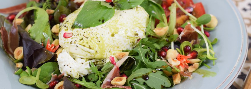 Salată cu burrata, rodie, alune de pădure și ulei din semințe de dovleac