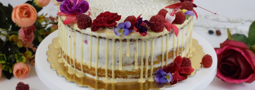 Drip carrot cake cu cremă de mascarpone, zmeură și flori comestibile